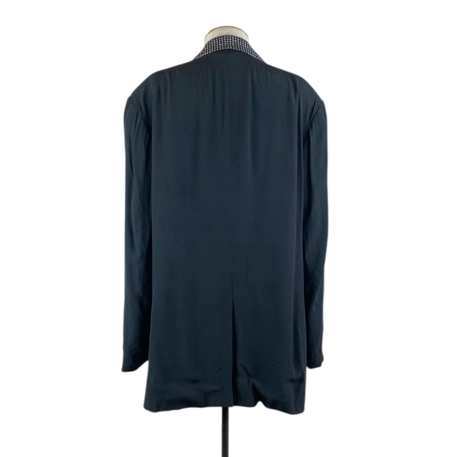 The jacket features silver studs on the lapels, and pocket flaps.