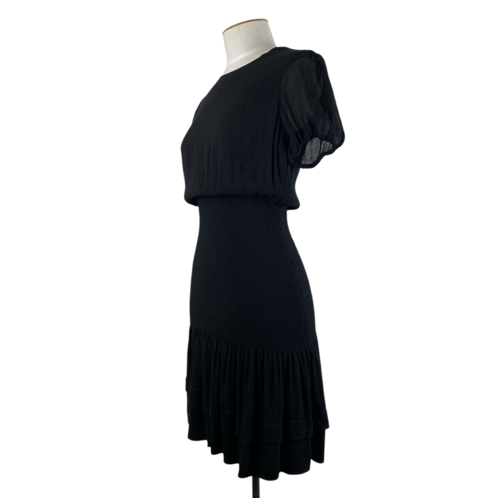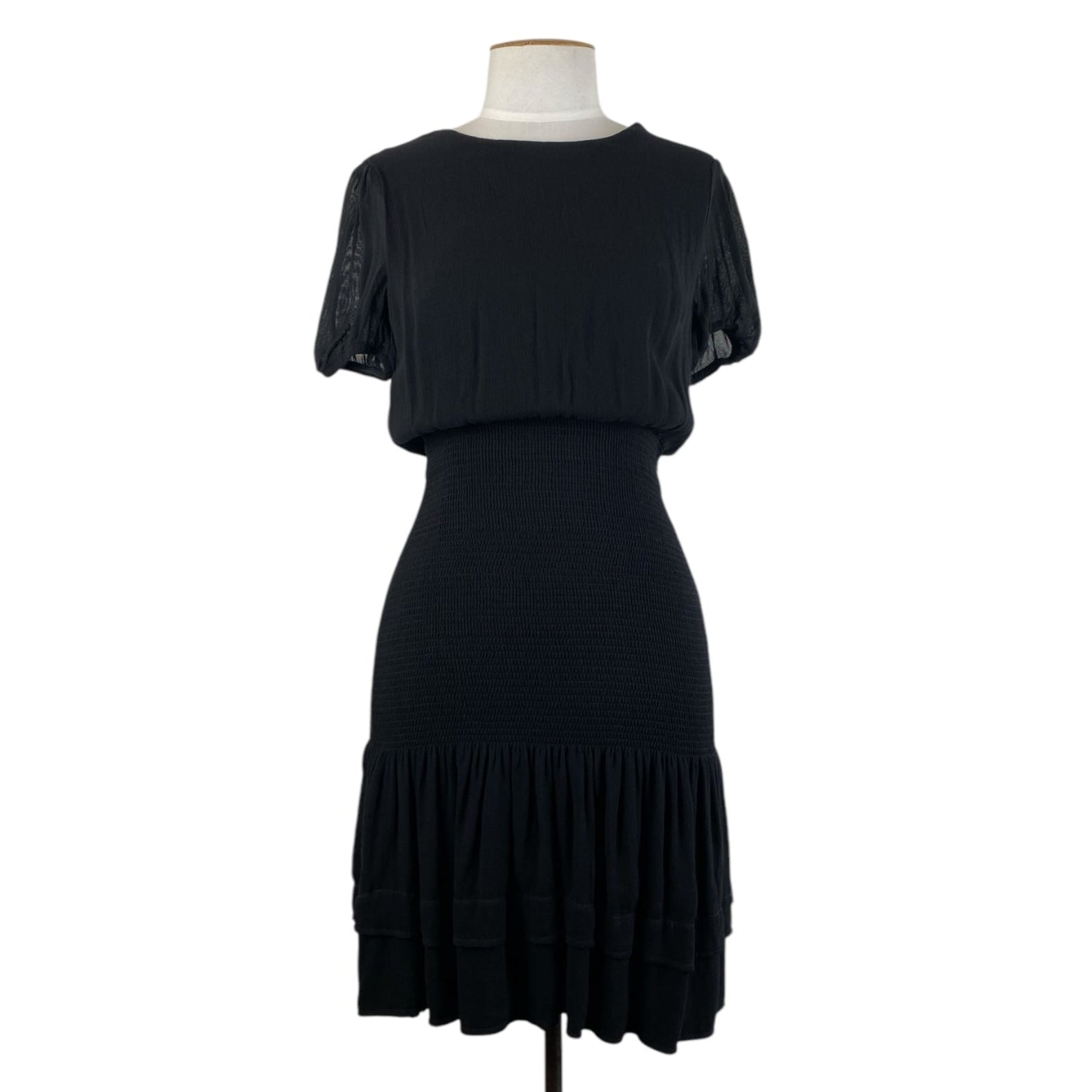 This style is super cute. The waist/hip area is shirred elastic creating a corset effect for a super-flattering silhouette. Short sleeve with elastic.