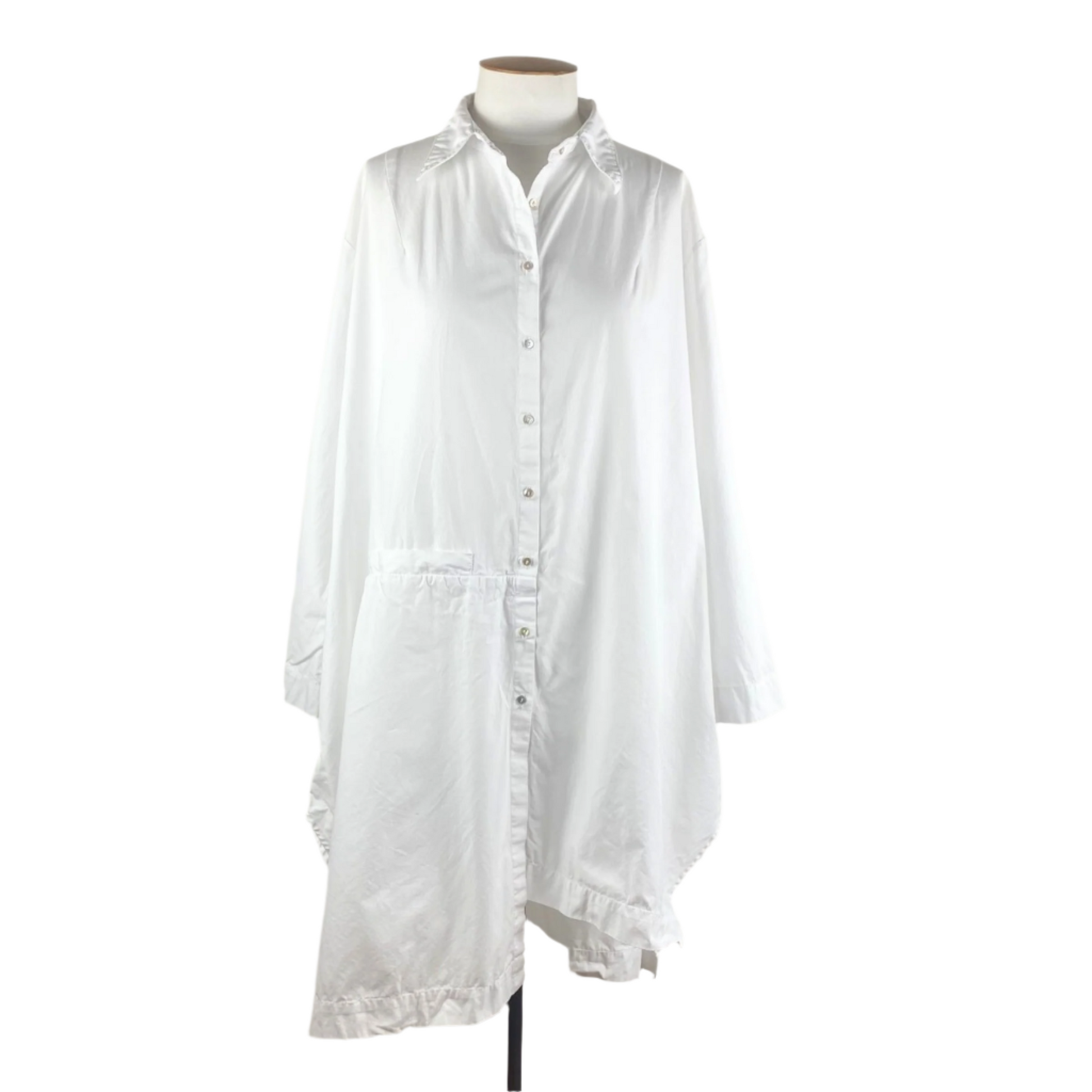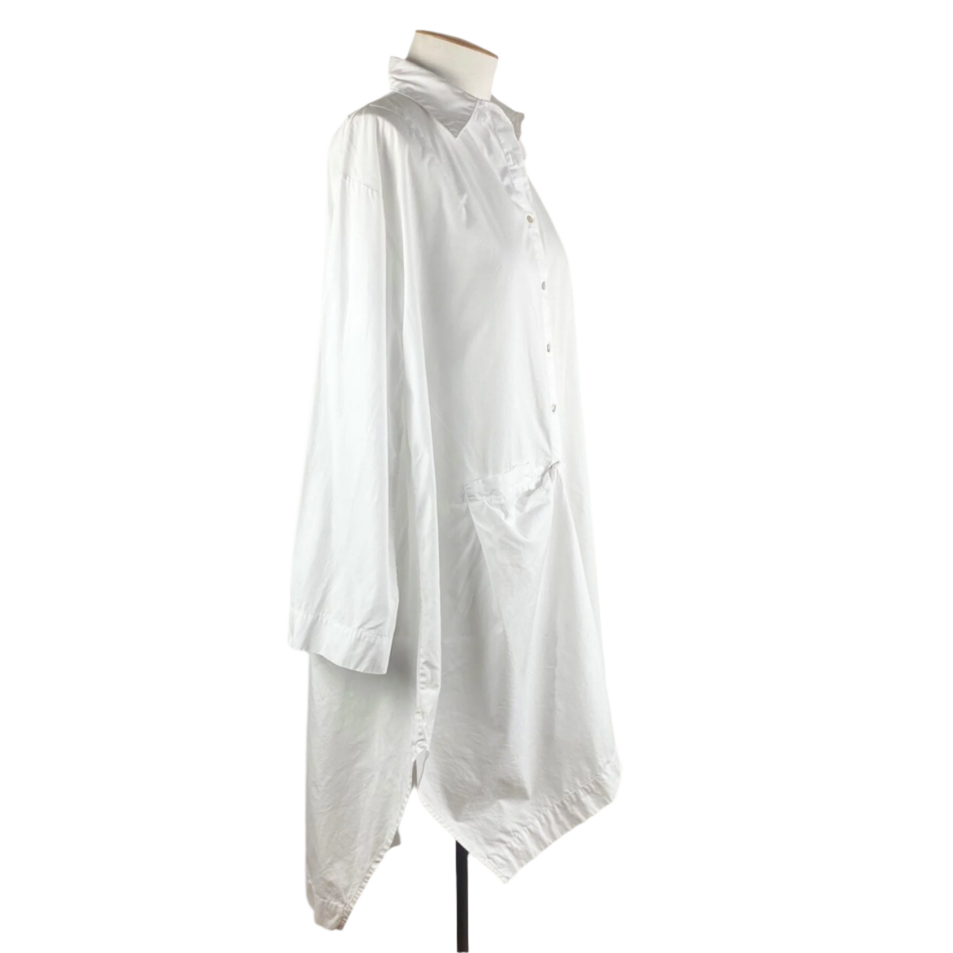 Description: This white shirt is one of the coolest around. Asymmetrical elements add to the deconstructed architectural feel of this garment. Buttoning options as pictured allow multiple style choices. Made In Indonesia.